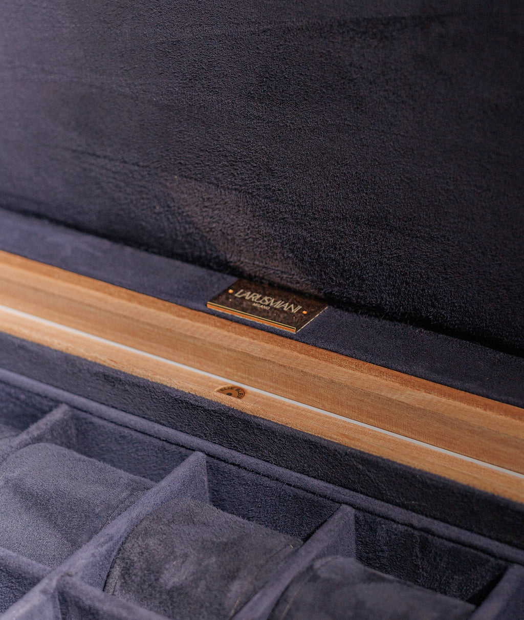 Scatola in legno di Sicomoro interamente foderata in alcantara e progettata per contenere fino a 18 orologi. Divisa in diversi scomparti, è dotata di piccoli e morbidi cuscini per riporre e poteggere gli orologi.