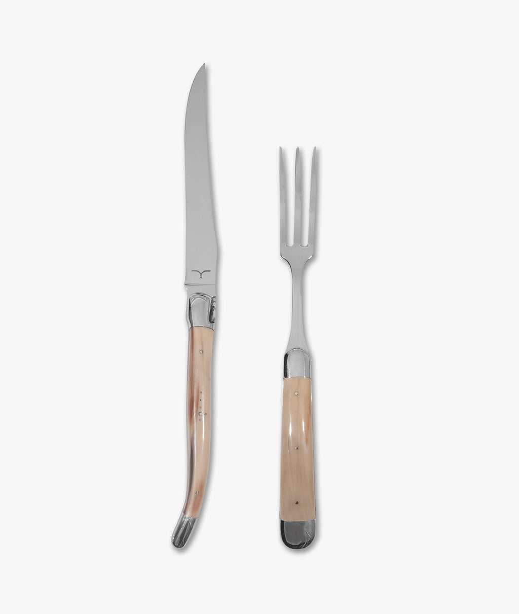 Il set Tajima prende il nome dal famoso bovino Kobe la cui carne è la migliore del mondo. Il set si caratterizza per i manici in corno di bue scuro, rifiniti a mano, per la lama del coltello e la forchetta in acciaio inossidabile lucidato di alta qualità, che garantisce una lunga durata nel tempo. Il "Tajima" porta un tocco di eleganza ad ogni barbecue.