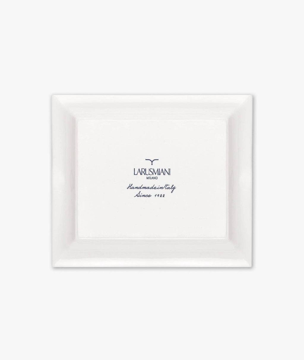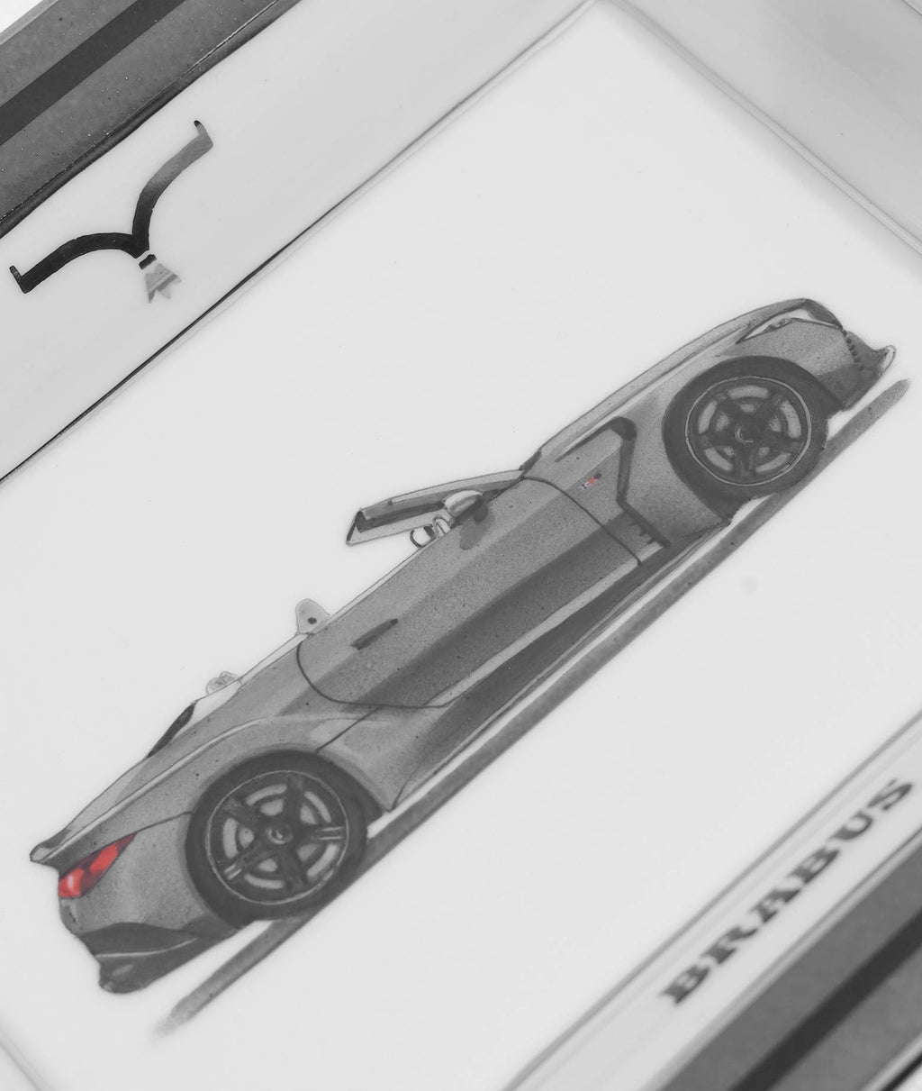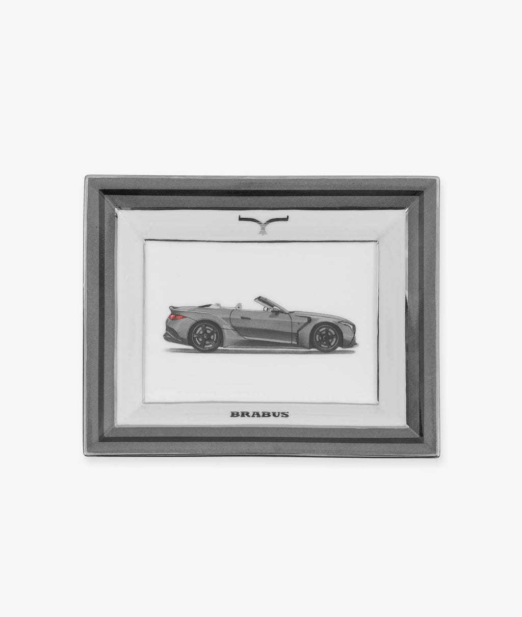 Svuotatasche realizzato in porcellana francese di Limoges e dipinto a mano dagli artigiani LARUSMIANI di Milano, rappresenta la Brabus Rocket GTC, auto che fonde la dinamica di una moderna Hyper GT con la libertà della guida "en plein air" in una supercar realizzata interamente in fibra di carbonio a vista.