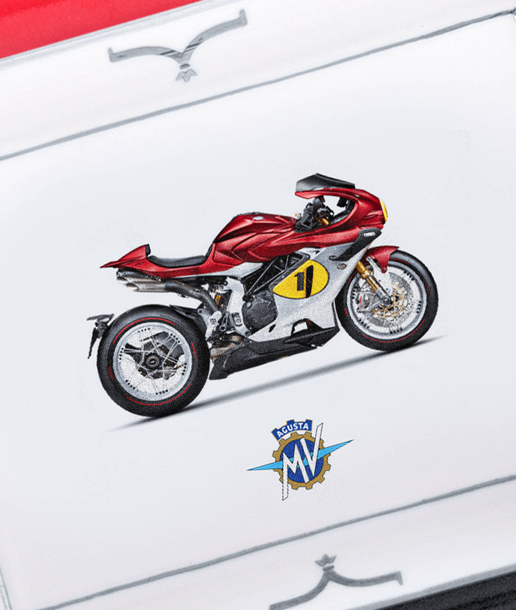 Svuotatasche realizzato in porcellana francese di Limoges e dipinto a mano dagli artigiani LARUSMIANI di Milano, raffigura la MV Agusta Superveloce 1000 Ago, tributo al leggendario Giacomo Agostini. Prodotta in soli 83 esemplari al mondo, la moto incarna velocità, eleganza e storia. I bordi dello svuotatasche richiamano i colori iconici rosso e argento della Superveloce, esaltando il design raffinato e sportivo.