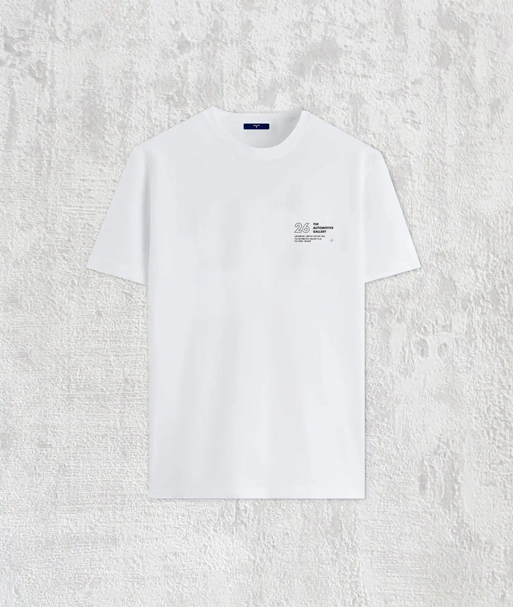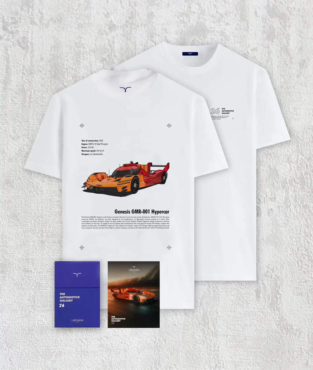 La t-shirt bianca in 100% cotone, orgogliosamente prodotta in Italia, presenta una stampa dedicata alla purezza estetica della GMR-001. Il capo è custodito all'interno dell'esclusiva scatola da collezione in blu Larus, unendo l'eccellenza artigianale all'adrenalina delle corse.